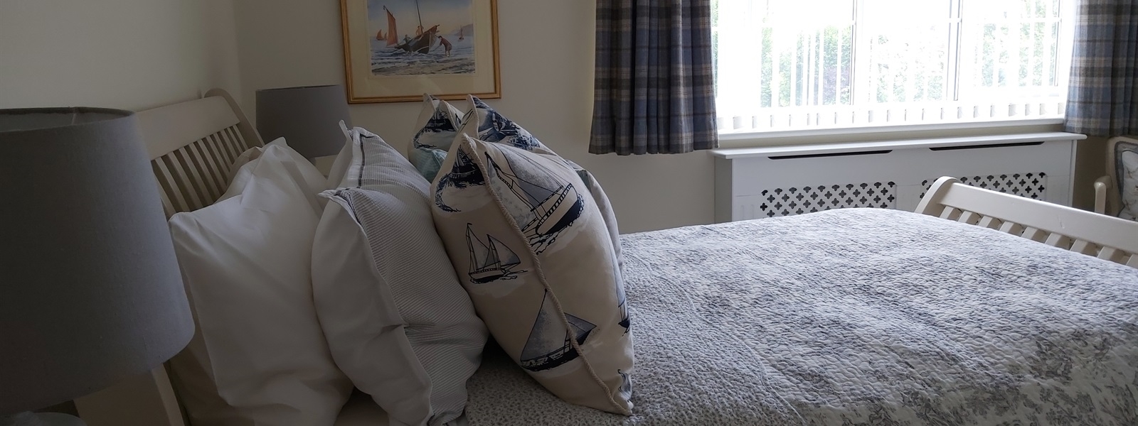 Bright and spacious marine themed double with en-suite shower room. The largest of our two rooms overlooking the front of the house